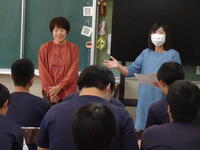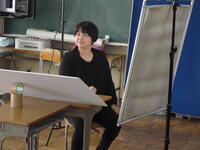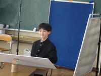 授業が終わると講師の先生と授業者による個別指導を行っていただきます。この時間が、とても大切だと考えて取り入れています。普段の授業で思っていることや立ち止まっている悩みへの打開策など、直接講師の先生からアドバイスをいただける貴重な時間です。(美術の講師の先生に見覚えがありませんか?そうです。昨年まで勤務していただいた石崎先生に講師をお願いしました。)