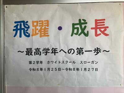 3階、2年生の廊下には、早くも1月に行くホワイトスクールのスローガンが掲げられていました。