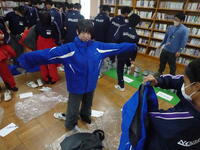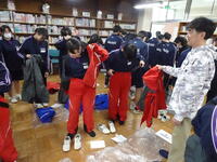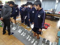 先日2年生の廊下に掲示してあるスキースクールのスローガンを紹介しましたが、本日6校時には早速ウエアとスキーブーツのサイズ合わせを行いました。