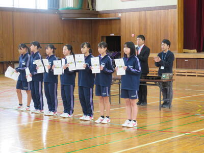 「善行賞」の団体の部で女子バレー部(代表4名)が、「実践文」では個人で2名が受賞しました。