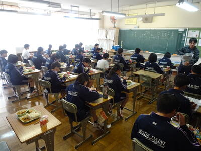 給食については、十分な距離がとれないこと、班で食べることに慣れていないことから、当面は正面を向いて大声をださないで食べることにしました。