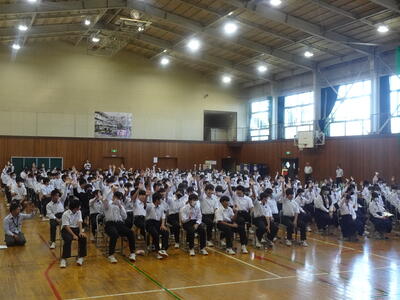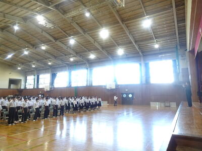 登校後は清掃を行い、その後全校集会を開きました。