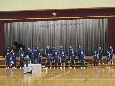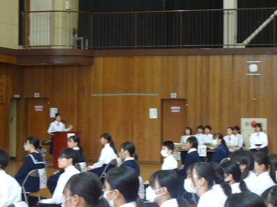 今日の生徒集会では、表彰(弁論大会、読書感想文コンクール、音楽部、バトミントン部)を行った後、部長任命式、東葛駅伝報告、2年生宇宙一プロジェクト紹介、善行賞(善い行いをした生徒に贈る賞)を行いました。