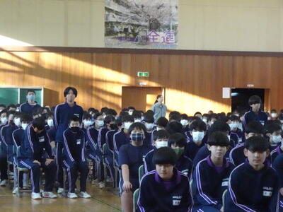 その後、中野先生から「冬休み前の集会の話の振り返りや災害や事故についての話」を、校長からは「新年の抱負(一年の目標)や令和5年度の締めくくりの3ヶ月で「宇宙一」輝く学校にしていこうという話」をしました。