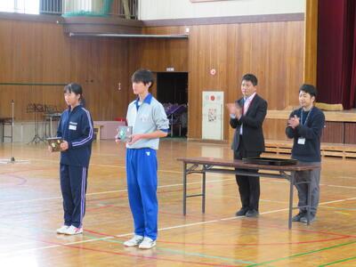 今日の生徒集会では、表彰(弁論大会、読書感想文コンクール、音楽部、バトミントン部)を行った後、部長任命式、東葛駅伝報告、2年生宇宙一プロジェクト紹介、善行賞(善い行いをした生徒に贈る賞)を行いました。