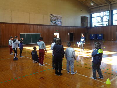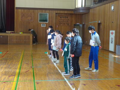小中混合で6チームをつくり3コートで「ボッチャ」の試合をしました。