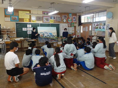 「対話型鑑賞」の学習で、作品を見て感じたことや疑問に思ったことを作者の先生に質問したり、楽しそうに友達と会話をする様子がとても良かったと思います。