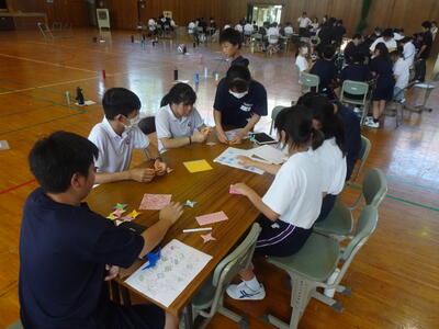 その後は体育館で1年生との交流会で「言葉での交流」や「折り紙作り」などを行いました。