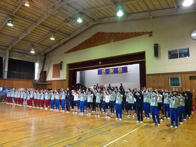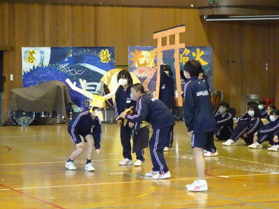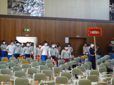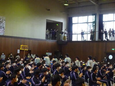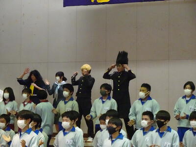 その後に全校応援団の引き継ぎ式、キャッチコピーの発表、部活動ムービー、職員発表、転勤した先生方からのメッセージビデオと盛りだくさんに会は進み、ラストは3年生の発表になりました。
