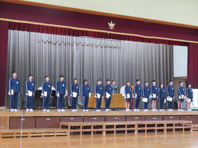 今日の生徒集会では、表彰(弁論大会、読書感想文コンクール、音楽部、バトミントン部)を行った後、部長任命式、東葛駅伝報告、2年生宇宙一プロジェクト紹介、善行賞(善い行いをした生徒に贈る賞)を行いました。