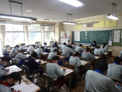 対象は標本抽出で二中の1年2組、2年3組、3年3組が選ばれ、今日は3年3組で実施し、教科は国語と理科をペーパーテスト、質問調査をオンラインで行いました。