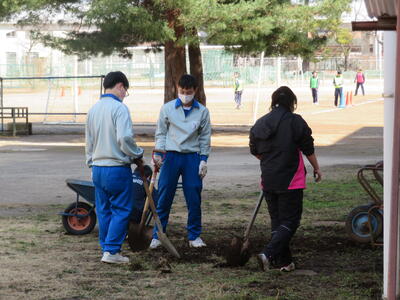 4、5時間目を使って、3年生が奉仕作業を行いました。主に1組は、家庭科室の壁紙の貼り替え、机の修理、校舎の窓拭きをし、2組は教材室の整理整頓、机・椅子の脚のマットの作成、中庭の雑草抜きをし、3組は旧正門のペンキ塗り、昇降口付近のアーチゲートのペンキ塗りを行いました。学校がとてもきれいになりました。3年生の皆さんありがとうございました。