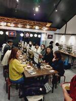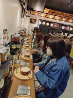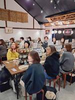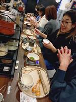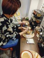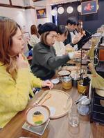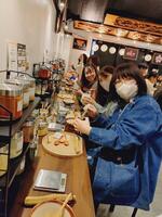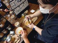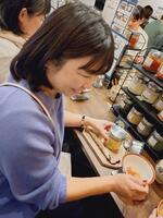七味作り体験の様子です。皆さん和気藹々と楽しく、自分好みの七味を作っているようです。