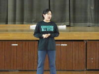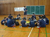 そして最後は、学年主任の伊波先生の話。「修学旅行のスローガン達成」のために、この旅行に携わった二中の3年生だけでなく、旅館の方々・添乗員さん・カメラマンさん・タクシーやバスの運転手さん等々、皆さん以外の全ての方々が笑顔でいられる旅行にしようと呼びかけました。