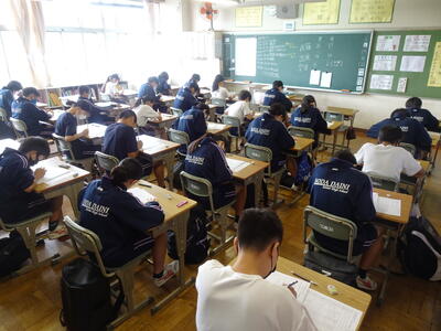 3年生のテスト中の様子を見に行きましたが、さすが受験生、真剣な表情でしっかりと取り組んでいました。