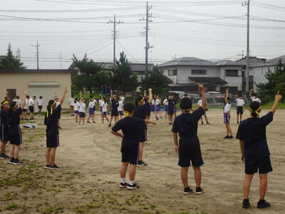 校庭に集合し、はじめに開会式、閉会式の隊形や流れの確認をしました。