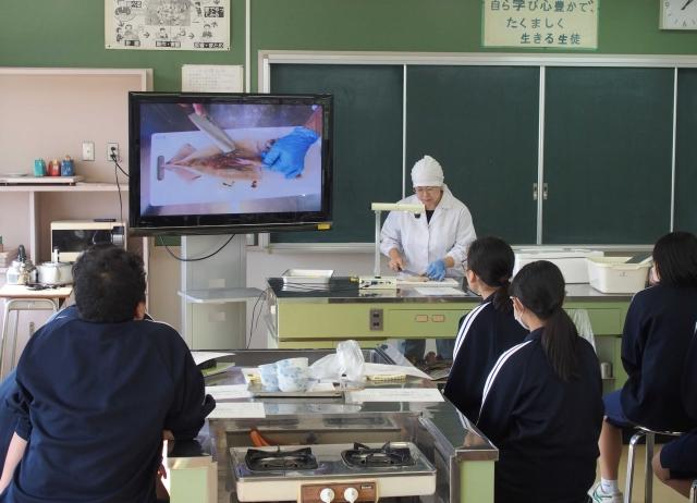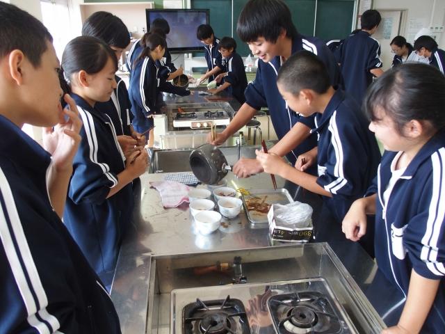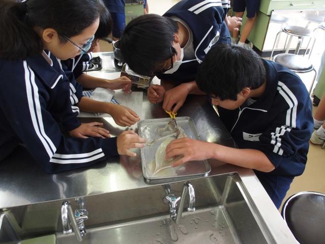 無脊椎動物の仲間・イカの体のつくりを調べる毎年恒例のイカの解剖観察実験を調理室で栄養教諭の協力を得て実施しました。アニサキスなどの寄生虫も観察出来ました。最後はお約束の醤油とお砂糖で煮て美味しく頂きました。理科担当教諭による解剖の手順観察のポイントなどの説明栄養教諭によるイカ調理法の説明解剖する生徒たち アニサキスなどの寄生虫も発見!最後は美味しくいただきます!