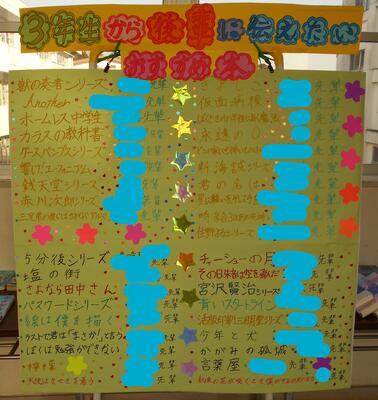 一覧へ ☆3年生から後輩に伝えたい『おすすめ本』☆ 投稿日時: 2021/03/03 fukukko 3年生図書委員が全3年生にアンケートを実施! 後輩に伝えたい『おすすめ本』がたくさんラインナップされました❣ 先輩たちの想いを受け止めて、ぜひ読んでみてください!