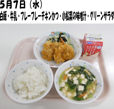 メニューは毎月末に行っている「給食アゲインアンケート」で5月の市内大会前日のメニュー「フレーフレーチキンかつ」が葛北総体・県総体に向け、再登場です!