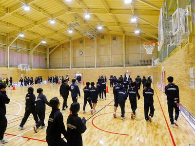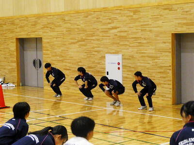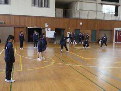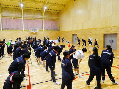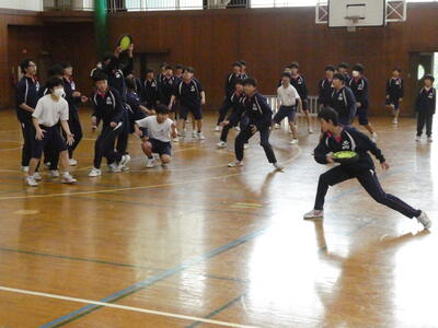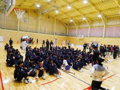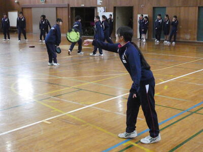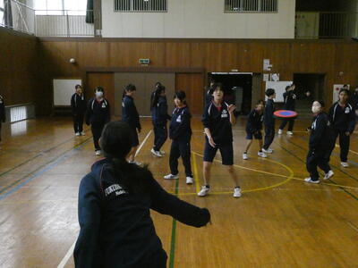 学校にもどり、体育館でドッチビー(ドッチボールのルールでボールではなく柔らかいディスクを使用)を行いました。