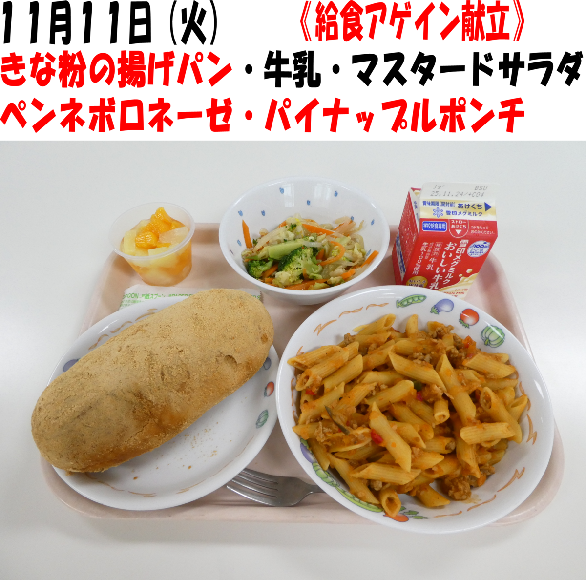 きな粉の揚げパン・ペンネボロネーゼ・パイナップルポンチ《給食アゲイン献立》