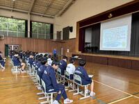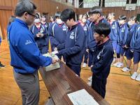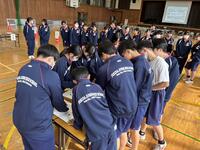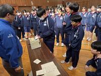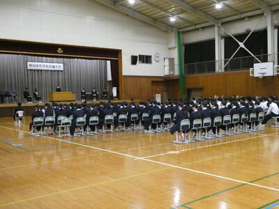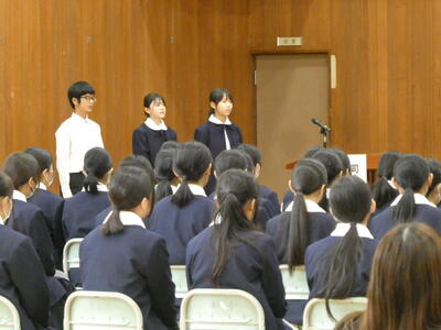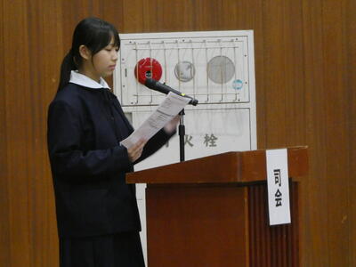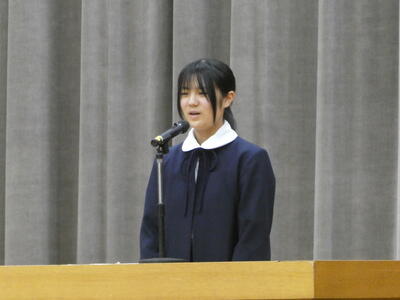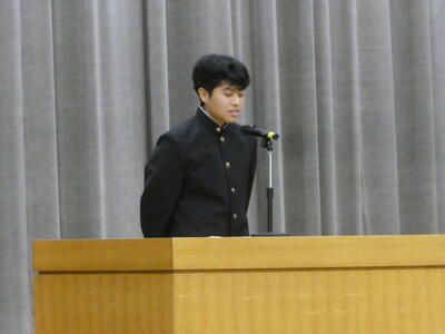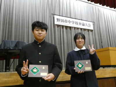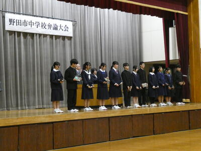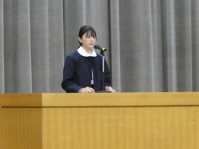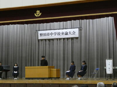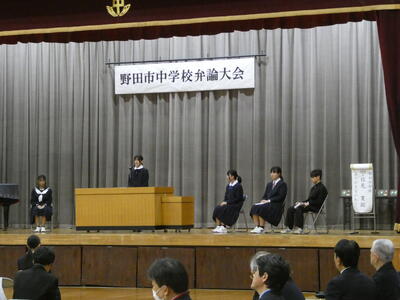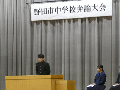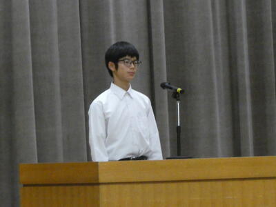 教育委員会や来賓の方々、市内中学校の校長先生方、さらに本校全生徒の前でかなり緊張したとは思いますが、堂々と論じました。