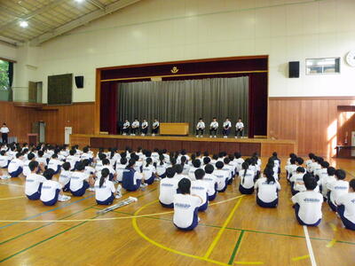 ・教室で出欠確認後、体育館に集まり、体育主任から本日の延期について、