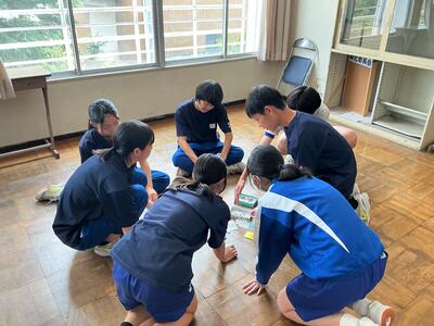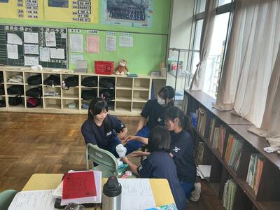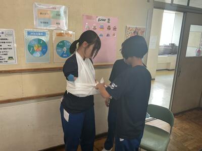 先日、2年生の保健体育の「応急手当」の授業では養護教諭の先生にもご協力いただき、グループごとにそれぞれの傷害に合わせて応急手当の実習を行いました。