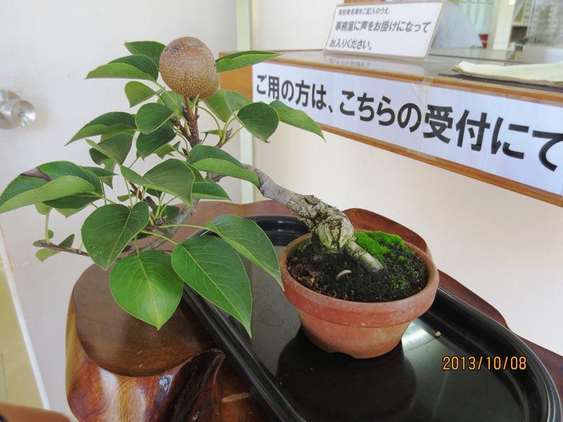 学校の玄関が,季節によって変化していることをご存じでしょうか。秋という季節は梨が旬です。本校には,稲橋教頭先生が手塩にかけて育てている盆栽(梨)が来校された方々をお出迎えしています。