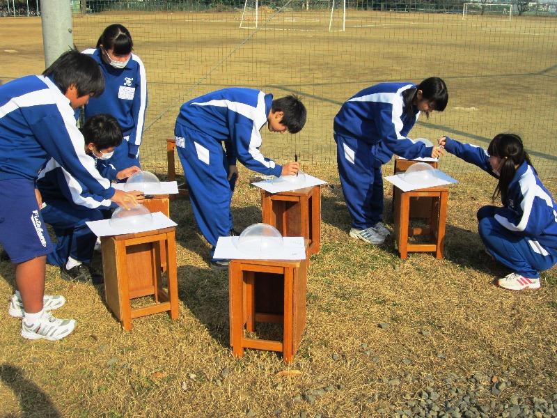 12月に入り穏やかな日差しの中,ふと外を見ると生徒たちが何やら作業を行っていました。話を聞いてみると,どうやら3年生の理科の授業で黄道の観察をしているようでした。授業の休み時間毎に外に出て,太陽の影になっているところに点を打つ作業を放課後まで行っていました。毎時間しっかりと真面目に取り組む姿に,二川中学校の素晴らしさを感じさせる一面でした。