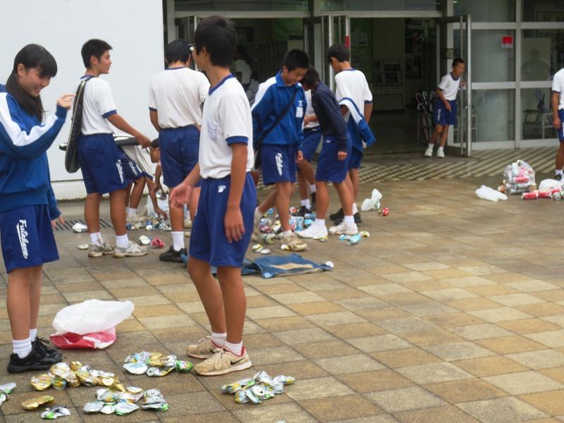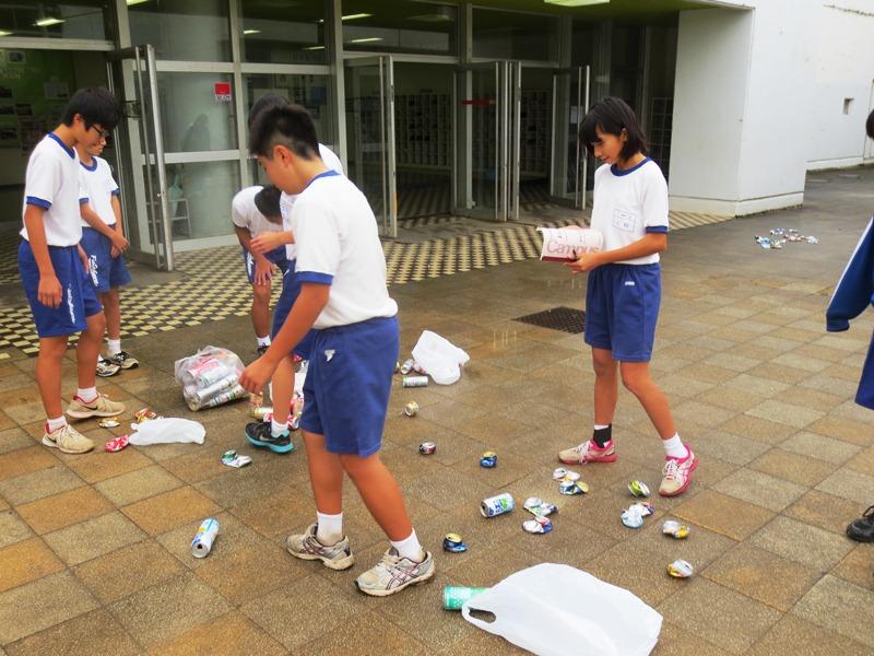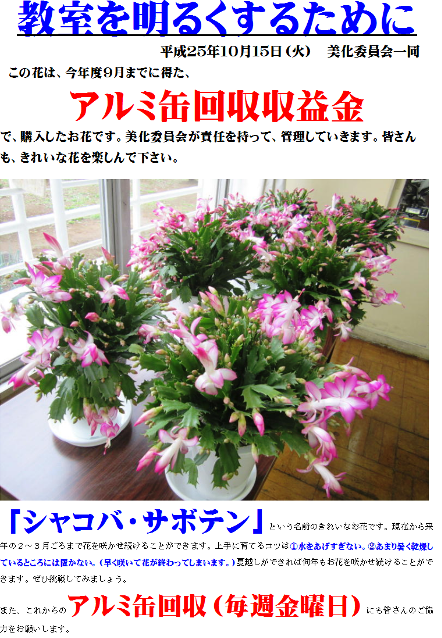 毎週金曜日に美化委員会を中心にアルミ缶回収が行われています。回収したアルミ缶で,毎年花を購入し各クラスで育てています。ご家庭でのご協力をよろしくお願いいたします。