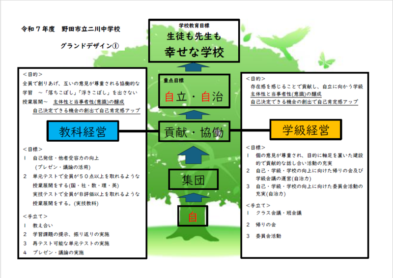 | 最上位目標『生徒も先生も幸せな学校』 今年度重点目標『自立・自治』 |