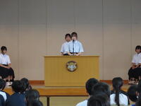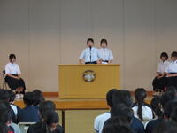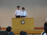 1校時は、夏季休業明け集会を行いました。夏季休業中の部活動の活動報告や生徒会や選挙管理委員会から話がありました。体育委員の3年生からから、体育祭に向けての心構えについて話があり、続いて体育祭のスローガンが発表されました。