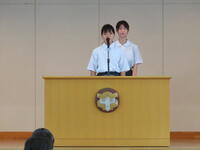 本日は、前期最終日。1校時に終業式を行いました。前期の振り返りとして、各学年代表の生徒が、半年間の頑張りや今後の目標を話してくれました。