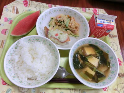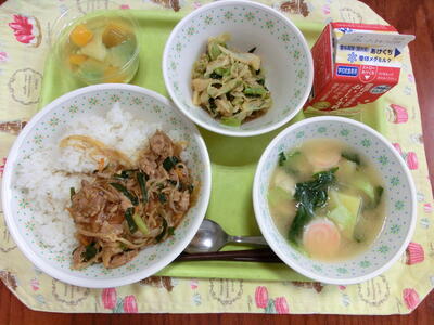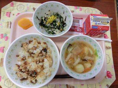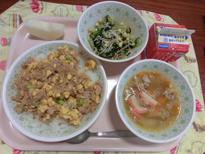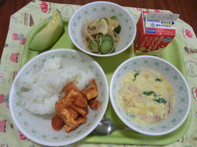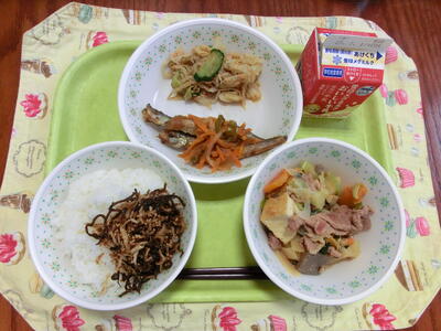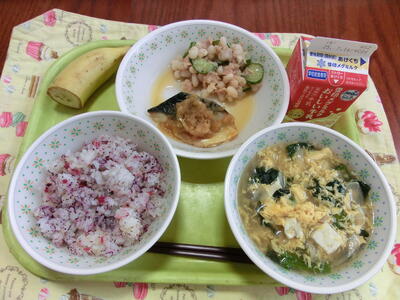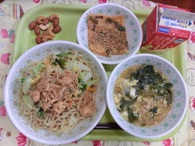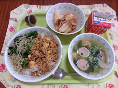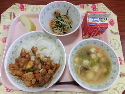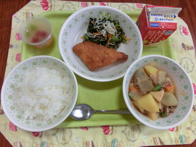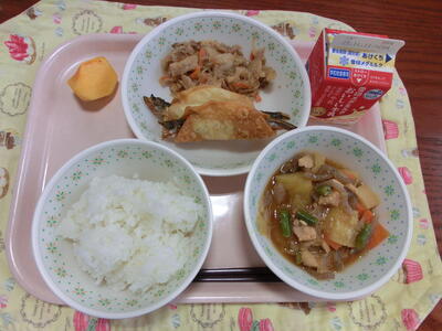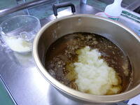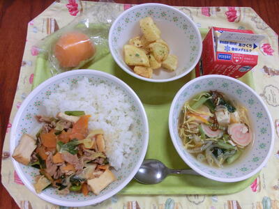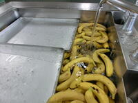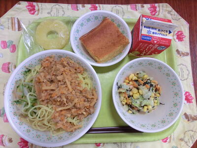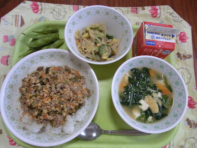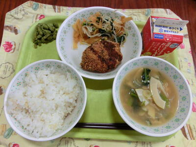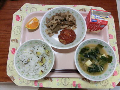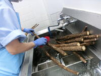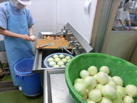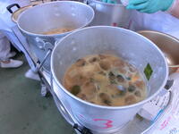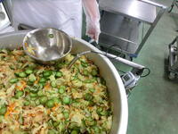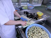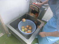 ごぼうの皮をむく様子。まだ6月ですが室温36℃でした。エアコンが無い調理場で、暑い中の調理ありがとうございます。生徒は、ほとんど残さず食べていました。