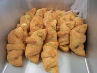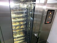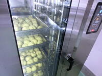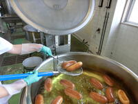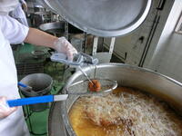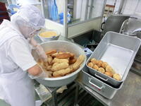 揚げパンを揚げ温度を計測し、すぐにココアをまぶしている様子。
