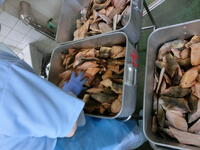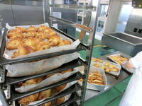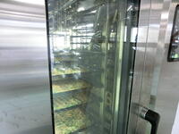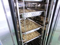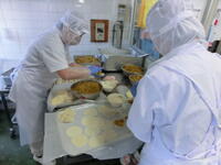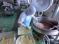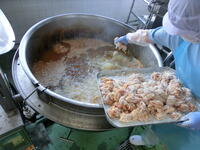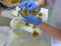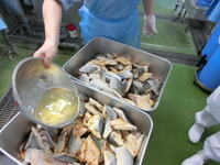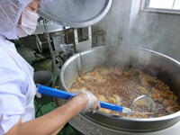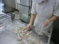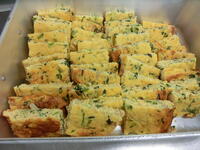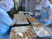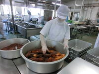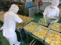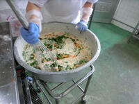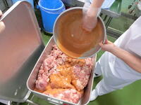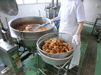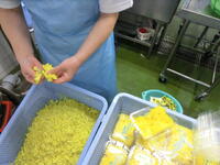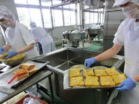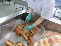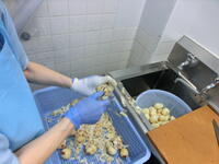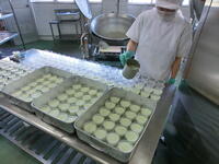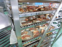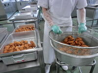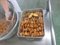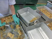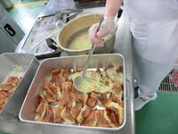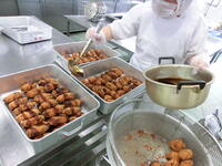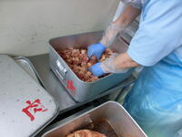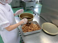 千葉県産の鶏肉に、香草パン粉をかけて焼き、クラスごとに配缶している様子。