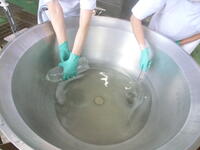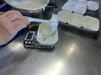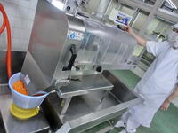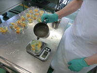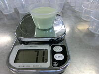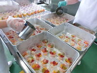 「いちごミルクゼリー」1個の出来上がり量を計量している様子。