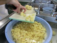 「豚肉と生揚げの味噌煮」に入るじゃが芋を切っている様子。