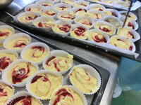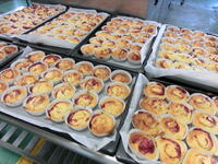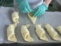 りんごは、青森県産。カットし釜で煮ている様子。クリームチーズをまぜデニッシュ生地で包みます。