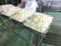 「ごぼうチップス」のごぼうを薄くスライスしている様子。泥付きのごぼうの皮をむいているので香りがよいです。小麦粉とでん粉を付け油で揚げます。サクサクしておいしいです。