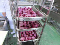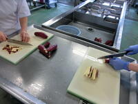 千葉県産のさつま芋を切っている様子。油で揚げて、吹き寄せご飯に入ります。