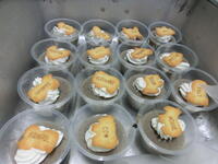 いちごゼリーをカップに入れミルクゼリー液を計量と同じに作っている様子。