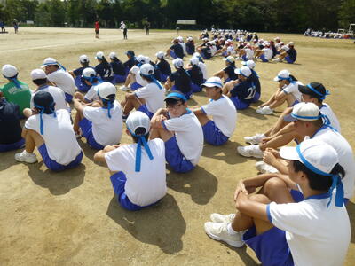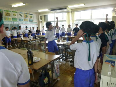 夏季休業明け集会では、夏季休業中の部活動の活動報告を行い、また生徒会や選挙管理委員会から話しがありました。校長先生からは葛北大会の感想や、これから頑張ってほしいことについておはなしがありました。地震を想定した避難訓練も行い、静かに素早く行動しました。避難に要した時間も、前回より1分ほど短縮しました。