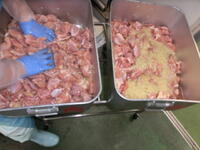 鶏モモ肉に塩コショウ・玉ねぎ・にんにく・レモン汁で下味をつけている様子。