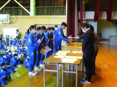 皆勤賞は、中学校生活3年間欠席、遅刻、早退がなかった31名の生徒に贈られました。そのうち4名は、小学校から9年間皆勤。本人の頑張りはもちろんですが、保護者の方の努力の賜物であると敬意を表します。