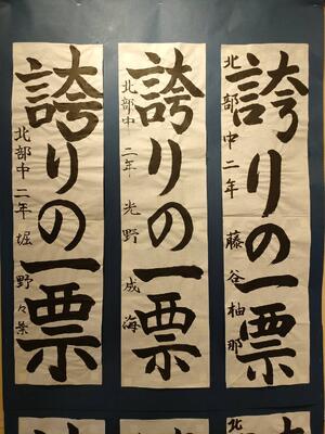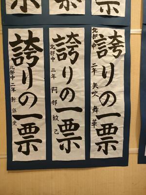 市役所のふれあいギャラリーで「明るい選挙書き初め展」が開催されました。本校からは65名の生徒が出品し、そのうち入選した22名の生徒の作品が展示されました。このような機会を通して選挙に関心を持ち、将来の社会参画につなげてほしいと願います。
