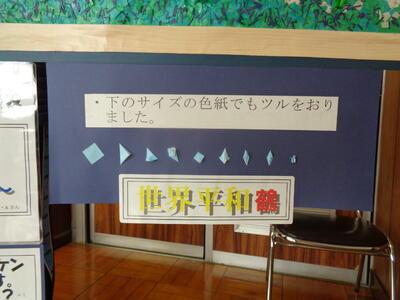 ひかり学級の生徒のコメント「がんばって富士山の貼り絵を完成させたり、ひたすら鶴をたくさん折りました。雲の上に綿を貼ったりして工夫しました。貼り絵のどこかに、手裏剣や小さな鶴が隠されています。ぜひ、探してみてください!」