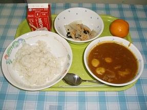 今日のメニューは、北中カレー、サクサクサラダ、ポンカンでした。