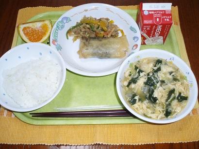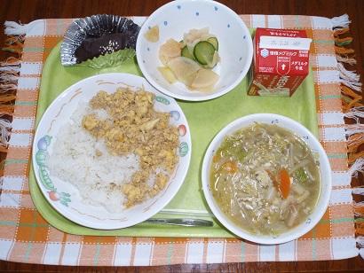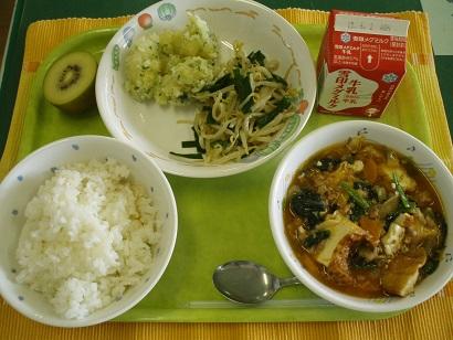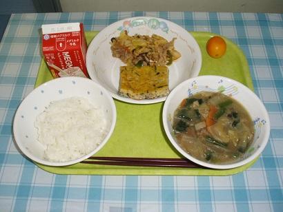 今日の給食のメニューは、豚肉とキムチの炒め物、味噌ワンタンスープ、